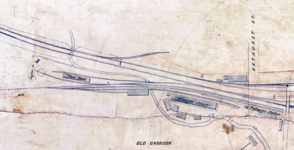 Efforts to construct a railway between Toronto and Hamilton began alongside the development of the Great Western. The two cities were in relatively close proximity to one another, and transit services in the form of stagecoach routes had already sprung up along the lakeshore between them. The Hamilton & Toronto Railway was initially chartered in December 1846 as an independent venture to connect the two cities, but the charter lapsed due to a lack of progress. Another company with the same name was incorporated in 1852 over the same route, possibly by individuals associated with the Great Western. In any case the Hamilton & Toronto was absorbed into the Great Western on October 4th, 1855 while its construction was still underway. The Great Western began accepting tenders for construction of a new rail terminal in Toronto on October 18th of the same year, to be built just north of Fort York on the west side of Bathurst Street. These facilities would include a passenger depot, a freight house, and a roundhouse among a variety of smaller auxiliary buildings. The first Great Western train arrived in Toronto on December 3rd, 1855, though an opening celebration was not held until three weeks later on December 20th. A banquet and grand ball was held in the Ontario, Simcoe & Huron Railway locomotive and car repair shops at the foot of Spadina Avenue since there was no venue in the city large enough to accommodate the estimated 5,000 attendees. Hotel space in Toronto was so scarce that 100 beds were set up in St. Lawrence Hall for out-of-town visitors. Among the guests was Sir Edmund Head, the Governor-General and John A. Macdonald, Attorney-General and future Prime Minister. A wooden floor was built over the tracks and the shop was unrecognizable as such once the decorations, including a fountain, were put in place. The New York Times reported that “The company, which was gay and brilliant in the extreme, and boasted of many of America’s fairest daughters, did not break up until a late hour”. While the Great Western’s Toronto Branch would eventually become a major rail artery, at this point in time it was treated as a secondary branch line which complemented the mainline between Niagara Falls and Windsor.