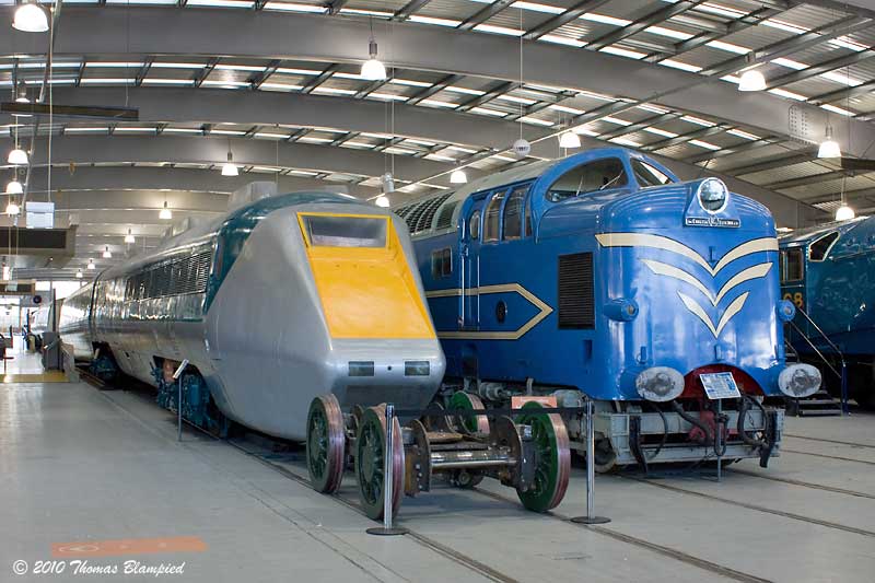 - Two generations of high-speed train, the ill-fated Advanced Passenger Train (APT) (left) and the earlier and highly successful prototype for the Class 55 “Deltic” diesels (right);