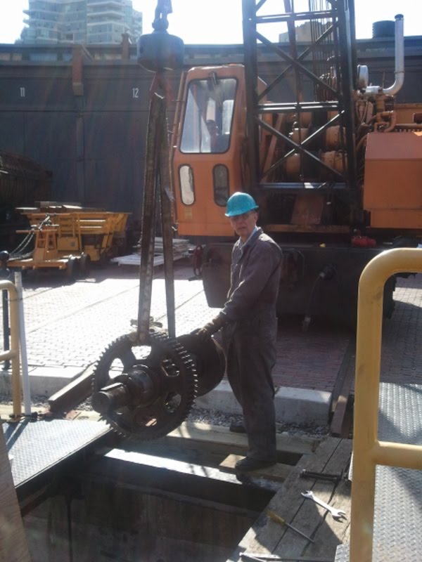 As with any piece of complex machinery, our turntable occasionally needs repair. We recently removed parts of one of the drive engines and sent them off for repair. In these photos, we find our volunteers using our Pyke crane to re-install some of these components.