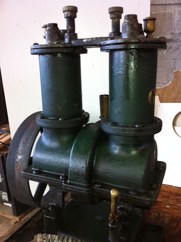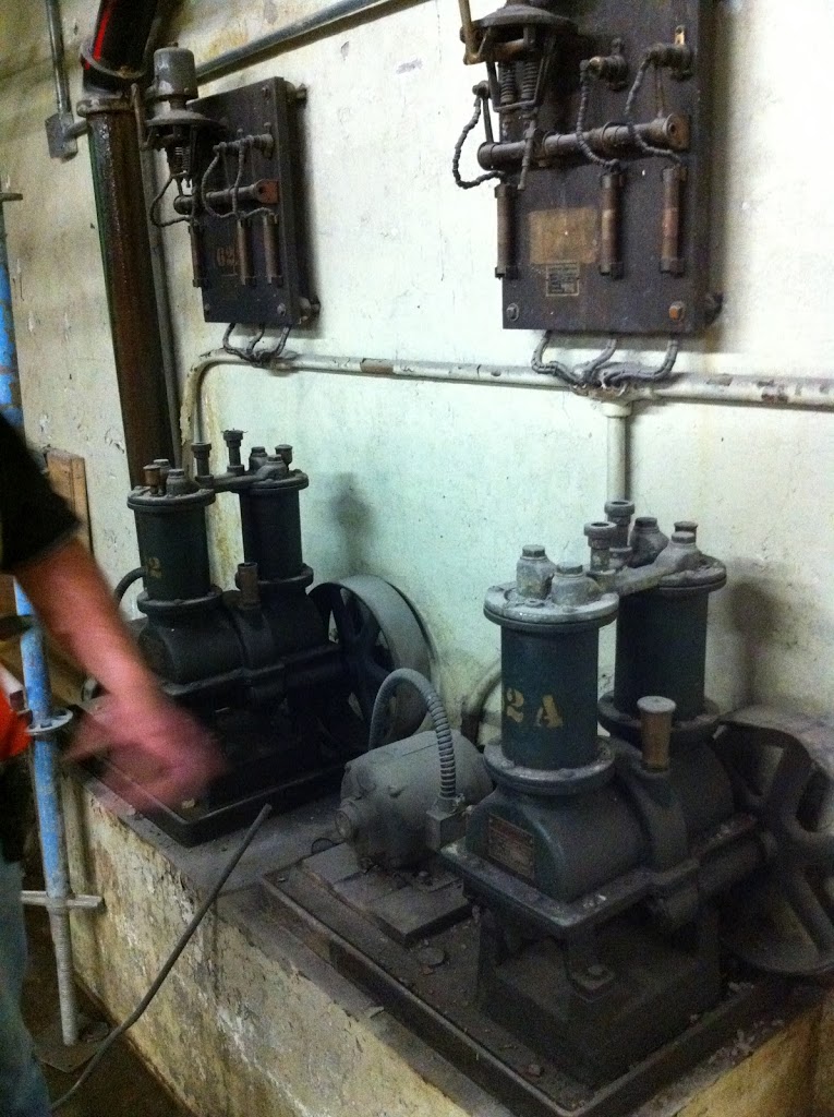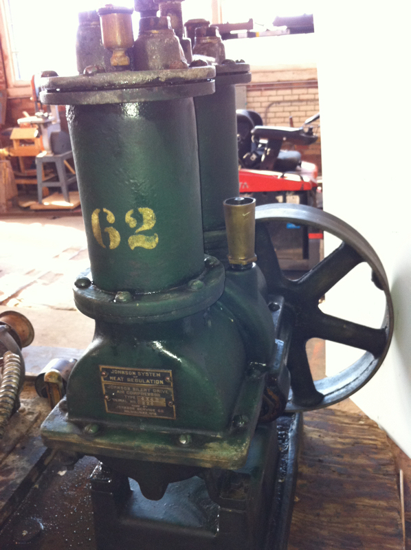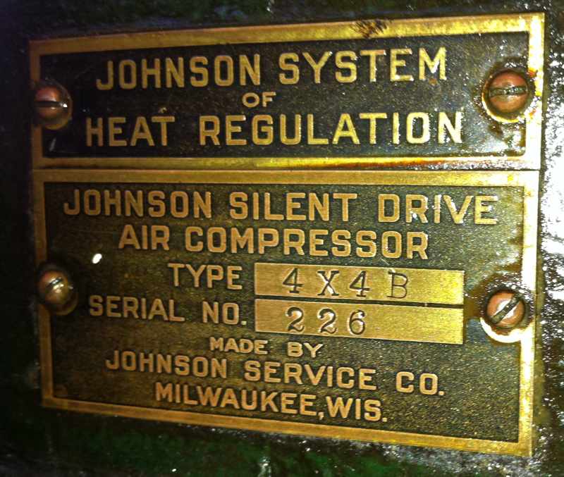 Our intrepid volunteer archeologists descended into the depths of Union Station which is undergoing major restoration and retrieved this “Johnson Silent Drive Air Compressor” from a basement fan room where a pair of them were used as part of Union Station’s HVAC system. It cleaned up very nicely and we expect that it can easily be restored to operation.