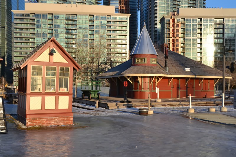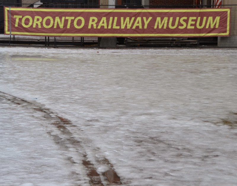 Around 11:00 a.m. this morning, we began to free up Whitcomb locomotive #1 which was iced in on  patio track 6. Together we cleared enough track to get #1 onto the turntable behind 6213 in preparation for equipment moves on Sunday. Ice chipping was a major item for much of the day as our volunteers cleared a path for the public to enter the museum and later moved on to clearing the rail head of track #34 in order to move #6213 there on Sunday to allow us to turn the Cape Race passenger car end for end.  The only thing that made any of this possible was the +6 C high temperature of the day with light rain that made the ice mostly soft and “punky”.  In places it was a full inch (2.54 cm) thick and very hard to move before the day warmed up.