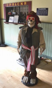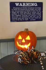 With October 31st and Halloween now upon us, last weekend we once again celebrated the occasion at Roundhouse Park with Halloween displays and costumed volunteers. Eight of our staff and volunteers were in costume – Dave, Elnora, Jay, Rodney, Mark, Bernadette, Lance and Bob. Don Station was decorated and we featured a cemetery in the trees.