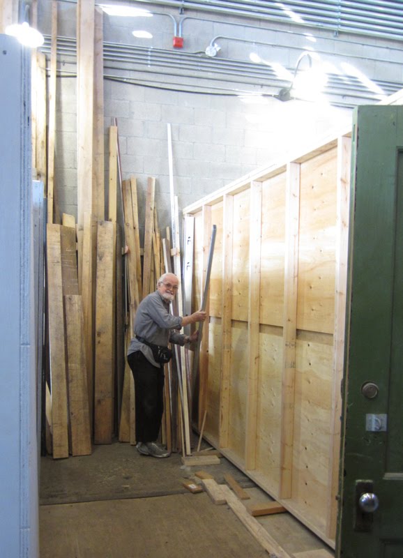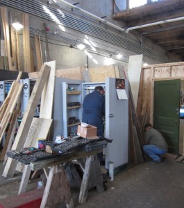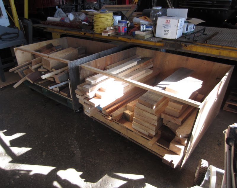 The wood storage: Every piece of wood is carefully kept and reviewed before it is deemed disposable. Every piece is reviewed, nails and screws removed from donated stock, and pieces are restocked in their appropriate place. Pieces are kept right down to 12″ long. To do this we have two rolling bins for short pieces 4 feet long and shorter, a small shelf for pieces 18″ to 12″ long, and a wall storage area for plywood sheets and large or long pieces of wood. This winter the storage for the long and over-sized pieces will be rebuilt to be more effective to store different sizes – the easier it is to sort through and see the wood supplies, the easier it is for us to to re-use wood and not waste larger pieces by cutting them up unnecessarily. This weekend we started the re-organization by removing all the wood from the wall storage and laying it out for sorting and accounting – a half day task at best. Next week we will begin to rebuild the wall storage area.