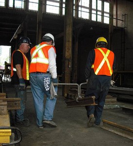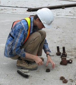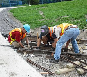 In the picture at the above left, we find our weekend volunteers moving sections of rail in the Roundhouse. In the middle and right hand picture, we find our folks working on one of the crossovers where the miniature railway track crosses one of the the standard gauge radial tracks. In the left hand picture below, we find a volunteer cleaning the threads on some bolts prior to their use. In the final two pictures at the middle and right below, a TRHA crew reinstalls the bumper posts now that some of the radial tracks have been shortened a bit.