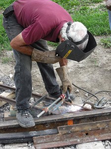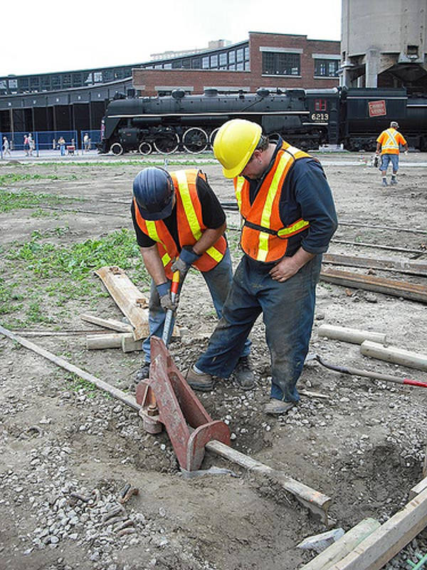 In the picture at the above left, we find our weekend volunteers moving sections of rail in the Roundhouse. In the middle and right hand picture, we find our folks working on one of the crossovers where the miniature railway track crosses one of the the standard gauge radial tracks. In the left hand picture below, we find a volunteer cleaning the threads on some bolts prior to their use. In the final two pictures at the middle and right below, a TRHA crew reinstalls the bumper posts now that some of the radial tracks have been shortened a bit.