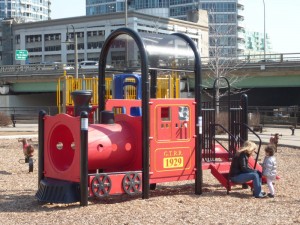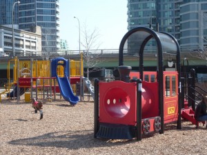 Finally, Michael reports that “It was a pleasure to see that the new railway-themed children’s playground in the south east corner of the park (see pictures below of the “GTRR 1929″ plastic engine and families playing on the equipment) was a popular place all weekend. Lots of young family members were enjoying climbing around the plastic engine and using the adjacent slide and climbing equipment. All dressed in winter clothing mind you but the sun was shining and fun was being had while it did.”