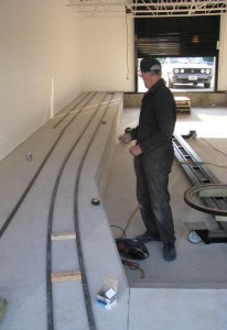 In this final series of weekend report pictures, we find Michael in the miniature railway train shed laying the track required to store our rolling stock. This went well and we now have two-thirds of the passenger car storage trackage bolted down and ready to use.