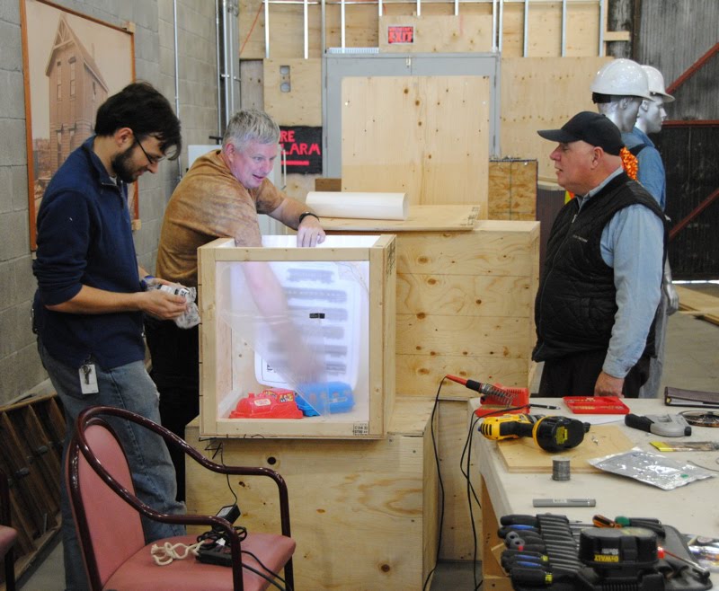 Work continued this weekend on the TH&B van. We also made progress on the display cabinets. In the photos, we find a test of a lighted display case. The work teams this weekend were a bit smaller as other volunteers took in the Barrie Train Show where the TRHA again had a booth promoting the Toronto Railway Heritage Centre.