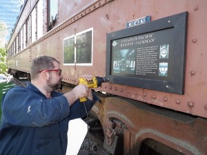 In the images below we continue to prepare appropriate mounting surfaces and then mount the plaques on our rolling stock. Once these are all in place, visitors will be able to read about each and every major piece of equipment as they stroll around the park. We also made great progress on the re-decking of the flat car which will be the topic of our next TRHA News posting.
