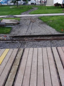 This weekend’s work crew addressed the many different tasks involved in the completion of the crossing of the mainline by the miniature railway just north of the station platform as can be seen in the remaining pictures above and below with the finished crossing shown in the lower left photo.