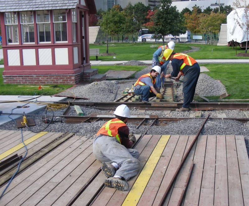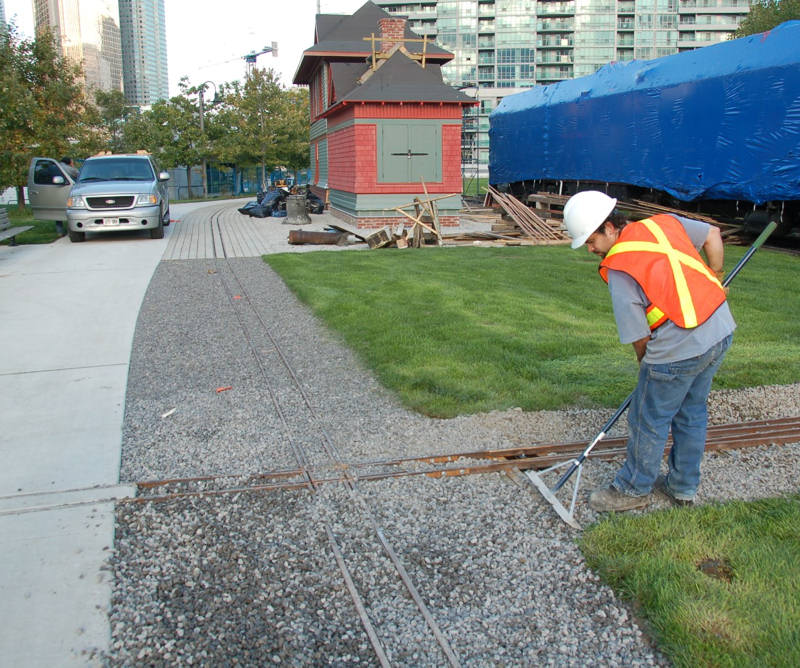 This weekend’s work crew addressed the many different tasks involved in the completion of the crossing of the mainline by the miniature railway just north of the station platform as can be seen in the remaining pictures above and below with the finished crossing shown in the lower left photo.