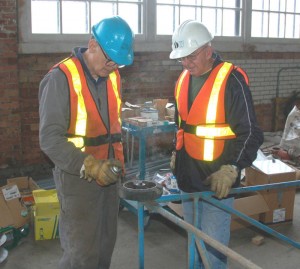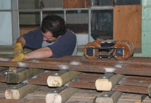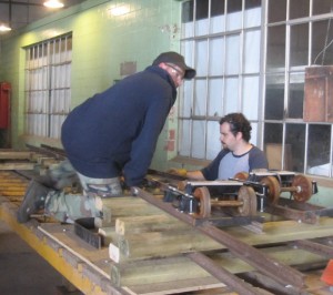 Inside the Roundhouse on Saturday, a number of our volunteers worked on a variety of metal working projects including the miniature switch destined for the north end of the station platform ( as shown in the pictures above). We stayed with this work until after six p.m. But when we left for the day, we were rewarded by our test trucks of both gauges running through the switch in both directions successfully.