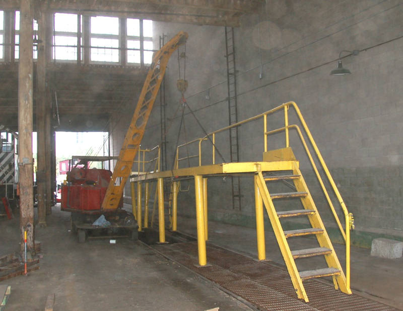 In the picture at the right below, we find Elwell the Crane in service moving the maintenance platform to a more appropriate location. In the two pictures at the lower left below, we find one of our crews doing maintenance on our wheeled scaffolding platform.