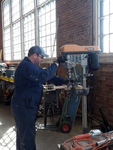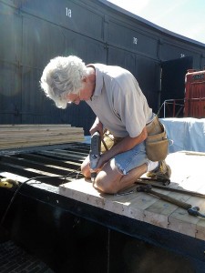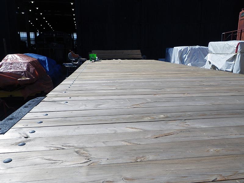 Work also continued this past weekend on the replacement of the wooden decking on the flat car. In this series of images we get a closer look at how this is done. TRHA volunteers are seen building heavy metal clips which are then used with large bolts to secure each board on the decking to the metal frame of the flat car. We have almost completed all of the decking.