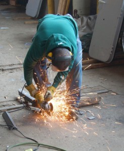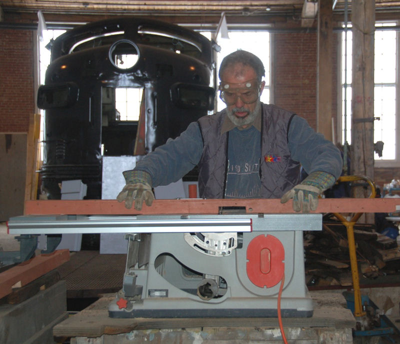 Meanwhile, on our third front (the F7 cab restoration front), our team primed the rest of the electrical compartment doors, as well as the insides of the exterior side doors. We also prepared two plywood patches on the engineer’s and fireman’s risers. Both are finished and ready to install. Three of our volunteers then started to cut the metal frame supports to support the sofa enclosure at the back of the cab. All pieces are cut, placed and ready to be welded.