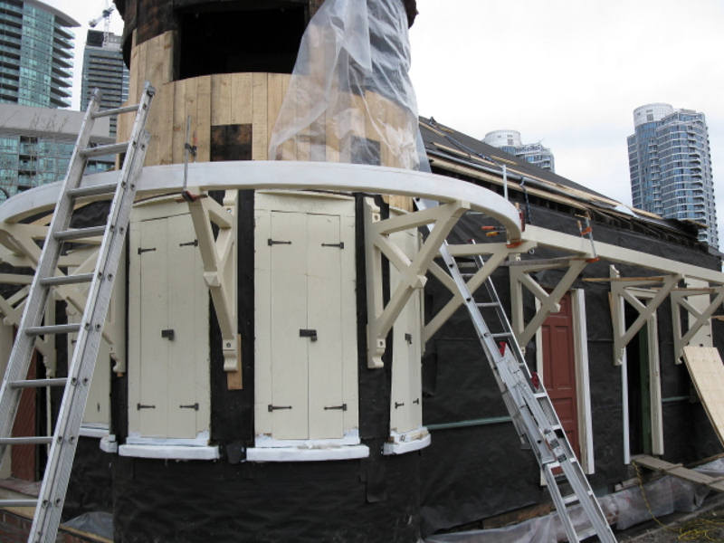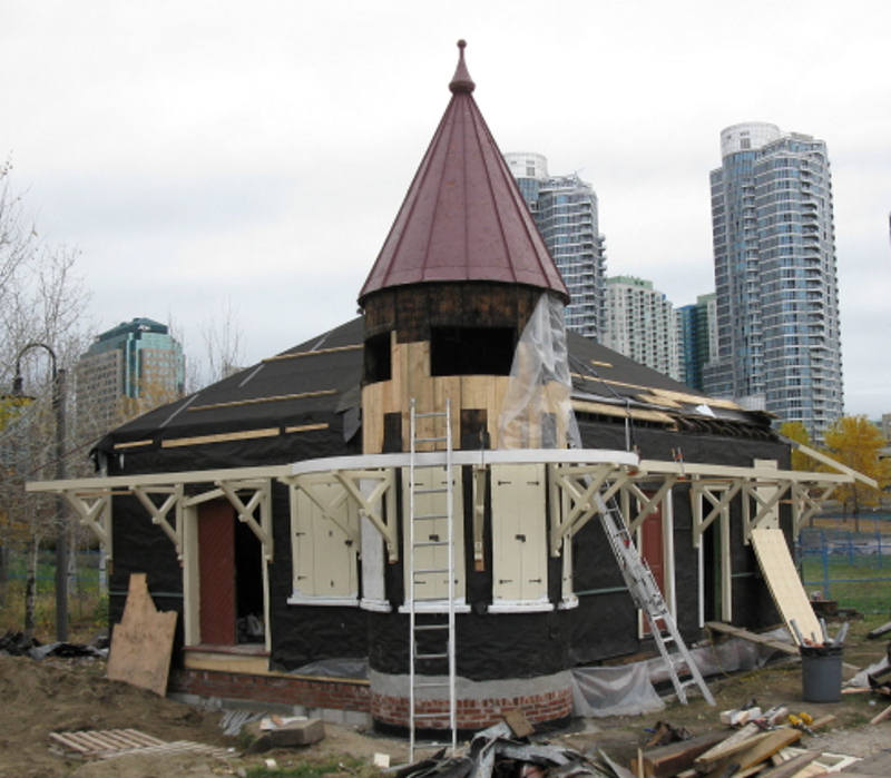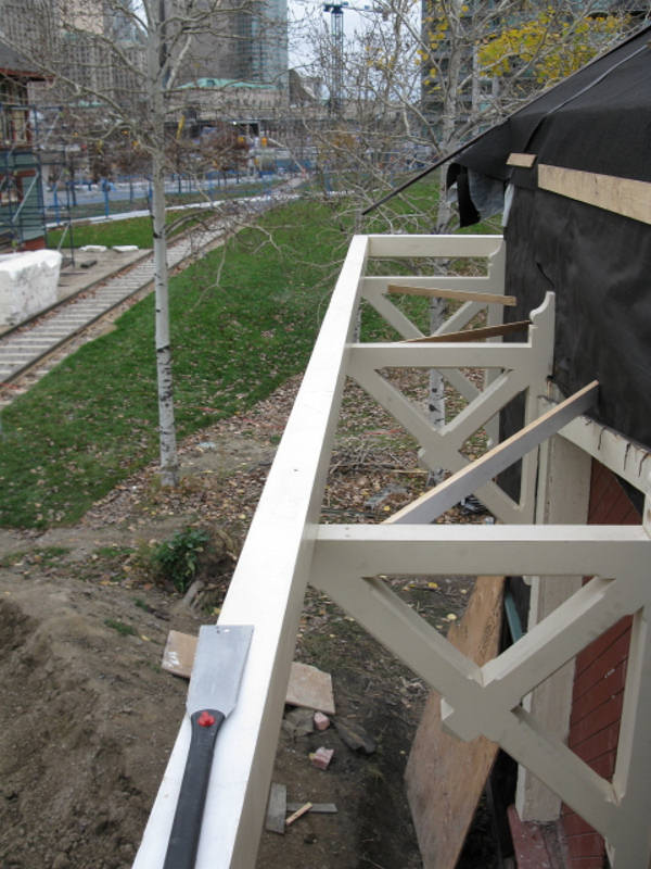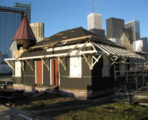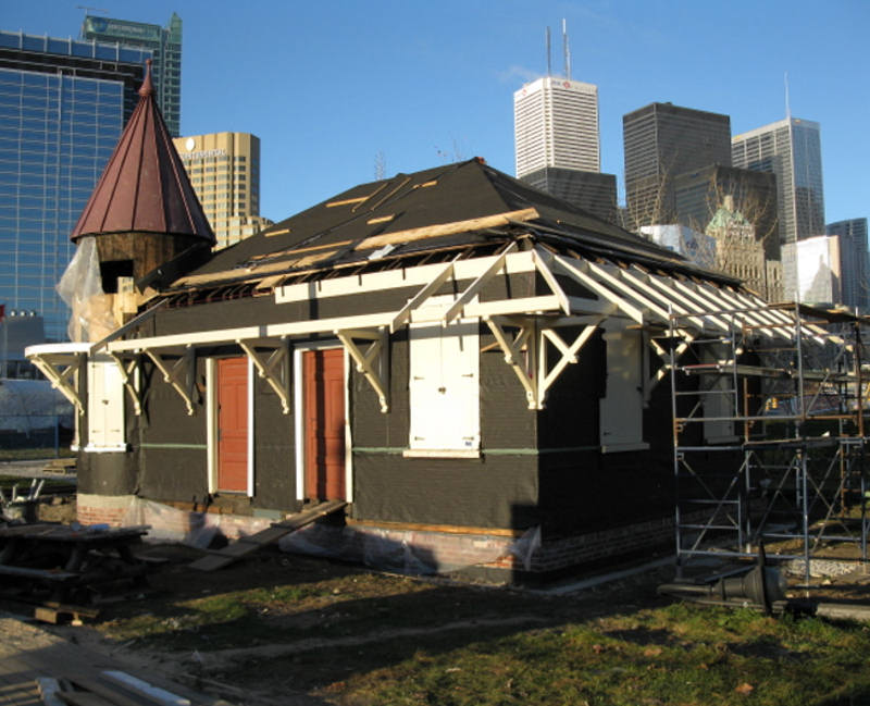 In the picture at the upper left (courtesy of the Toronto Public Library) , we see Don Station as it was in 1910 at the corner of the Don River and Queen Street. Tom Murison reports further on weekend progress on its restoration as follows.