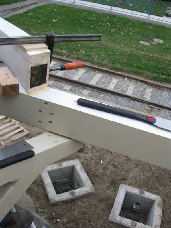 “We worked all weekend and have the cylindrical section of purlin installed around the turret, some of the rafters set on the west side, and most of the south side. We also installed the cap rail around most of the building with three small pieces left on the turret. We installed clapboard on the east wall and will be finishing that side tomorrow, moving on to the north side and then the two sunny sides.