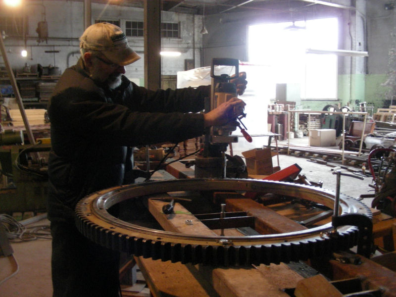 In the picture at the left below we find the crane in the Don Yard waiting to be moved. In the middle picture, bolt holes are being drilled into the turntable bearing for the miniature railway facility. In the picture at the right below, we find Tom Murison’s crew painting shingles in the Roundhouse as they continue to make progress on the restoration of Don Station.