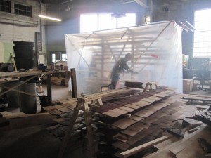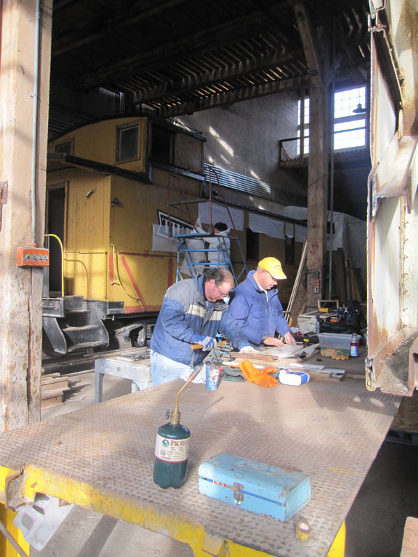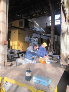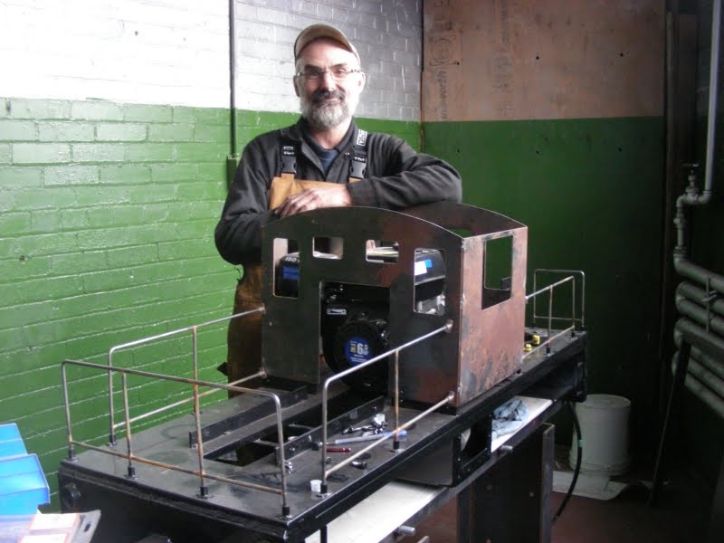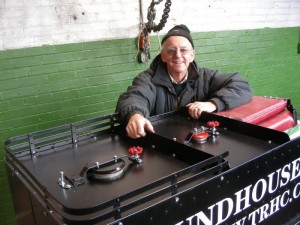 In the picture at the above left, we find Michael Guy admiring the progress that has been made on the development of the scale model of the TRHC’s full size CLC Whitcomb diesel switcher with a cab and handrails having been added to the chassis. In the middle photo, Mike Salisbury shows pride in the beautifully machined filler cap systems that he developed for the Sweet Creek locomotive to replace the “drop in” caps that came with the locomotive. In the picture at right, we find our “caboose team” hard at work at restoring the cupola seats and completing the tracing of the lettering on the caboose so that we can’t accurately duplicate it when the caboose is repainted.