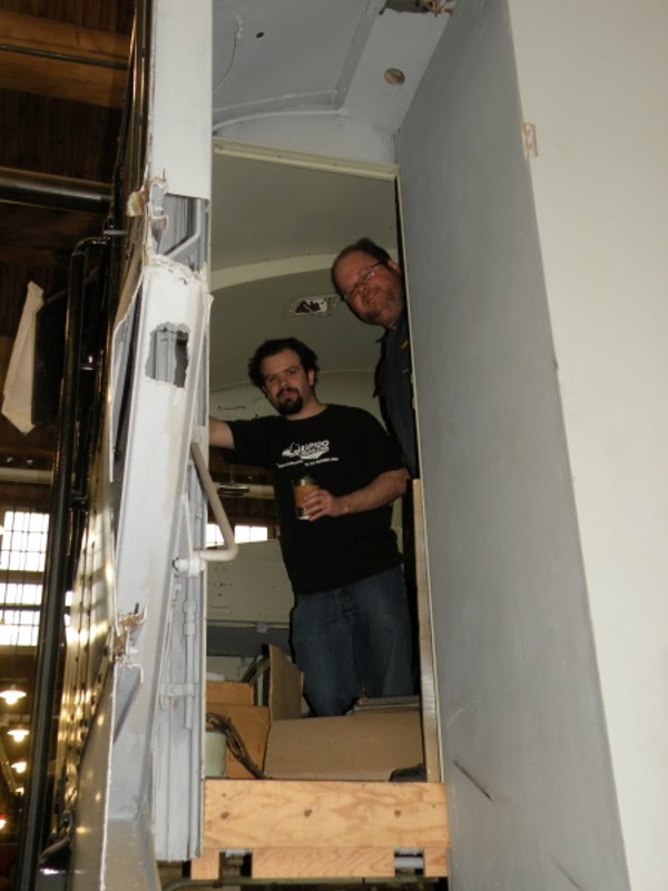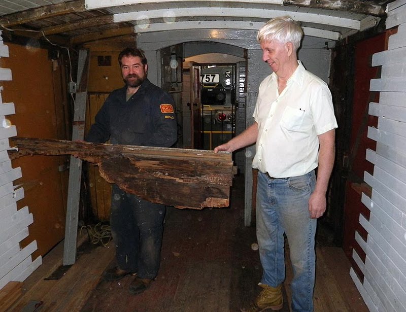 This Saturday, our volunteers were hard at work again on the F7 Cab and the TH&B Caboose restorations. The F7 cab crew worked on the laying of a linoleum tile in the cab, did some remedial work on the wall of the cab and prepared to start pulling electrical wire to provide interior lighting. The caboose crew began to remove the rotted wood in the cupola area of the caboose which had not as yet been tackled.