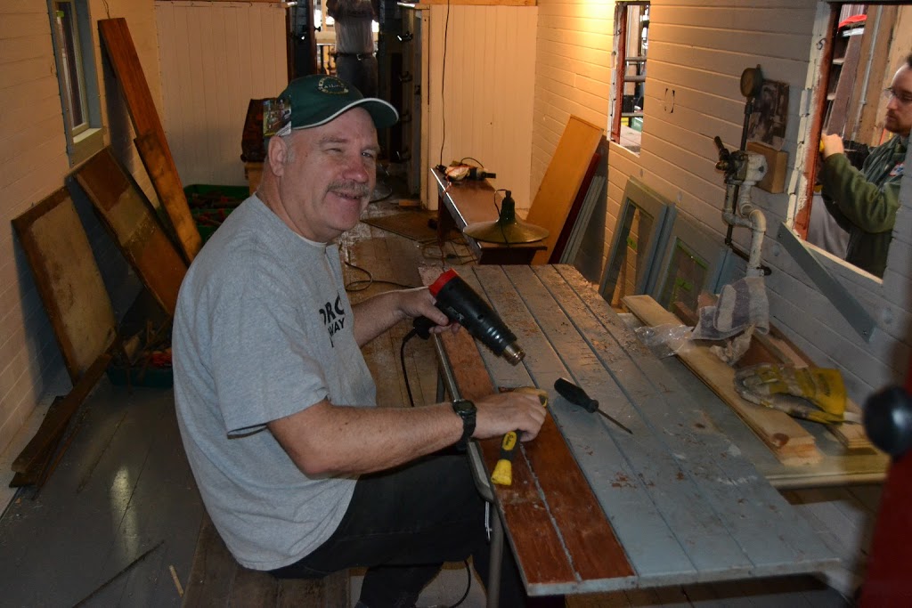 Most of our volunteers turn out on Saturday on a weekend.  This Saturday, we had a possible record 19 volunteers appear so much was accomplished.  A few helped Bob, our museum manager, welcome and interact with the growing number of weekend visitors to Roundhouse Park.