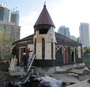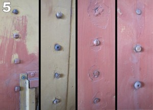 This past Saturday, James Rasor reports that “We had a good work party and welcomed a guest, Dave, from south of the border who is an active online fan of our venture and visits Toronto once a year for the Royal Winter Fair with his family. We started the day walking the site with Dave and reviewing the progress since he was here last year. Tom Murison gave us a review of the work-in-progress on the Don Station (Image #6) and showed us the woodwork that is being to replaced due to the old fire that damaged it in the past (Image #2) . Not wanting Dave to get too relaxed we put him to work helping us pull nails from wood that will be salvaged and put to good use later (Image #3). Others continued to work on switches and the restoration of the caboose. We also continued our quest to discover the true colours under all the paint layers on the TH&B caboose. Sadly, we could find no traces of any kind of any green paint schemes (Image #4). We had hoped that the caboose’s historic paint schemes included a suspected early TH&B green scheme. We did enjoy a good laugh at all the different types of fasteners found on the Caboose metal sheathing (Image #5). ”