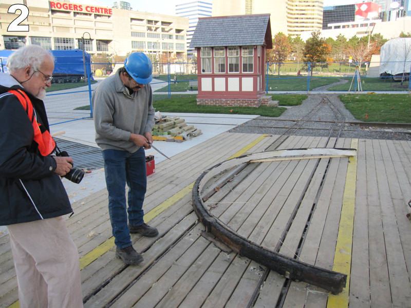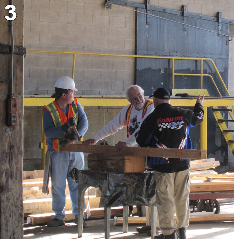 This past Saturday, James Rasor reports that “We had a good work party and welcomed a guest, Dave, from south of the border who is an active online fan of our venture and visits Toronto once a year for the Royal Winter Fair with his family. We started the day walking the site with Dave and reviewing the progress since he was here last year. Tom Murison gave us a review of the work-in-progress on the Don Station (Image #6) and showed us the woodwork that is being to replaced due to the old fire that damaged it in the past (Image #2) . Not wanting Dave to get too relaxed we put him to work helping us pull nails from wood that will be salvaged and put to good use later (Image #3). Others continued to work on switches and the restoration of the caboose. We also continued our quest to discover the true colours under all the paint layers on the TH&B caboose. Sadly, we could find no traces of any kind of any green paint schemes (Image #4). We had hoped that the caboose’s historic paint schemes included a suspected early TH&B green scheme. We did enjoy a good laugh at all the different types of fasteners found on the Caboose metal sheathing (Image #5). ”
