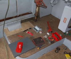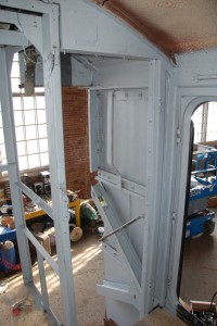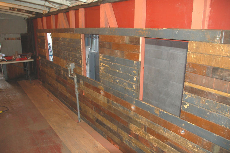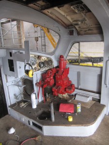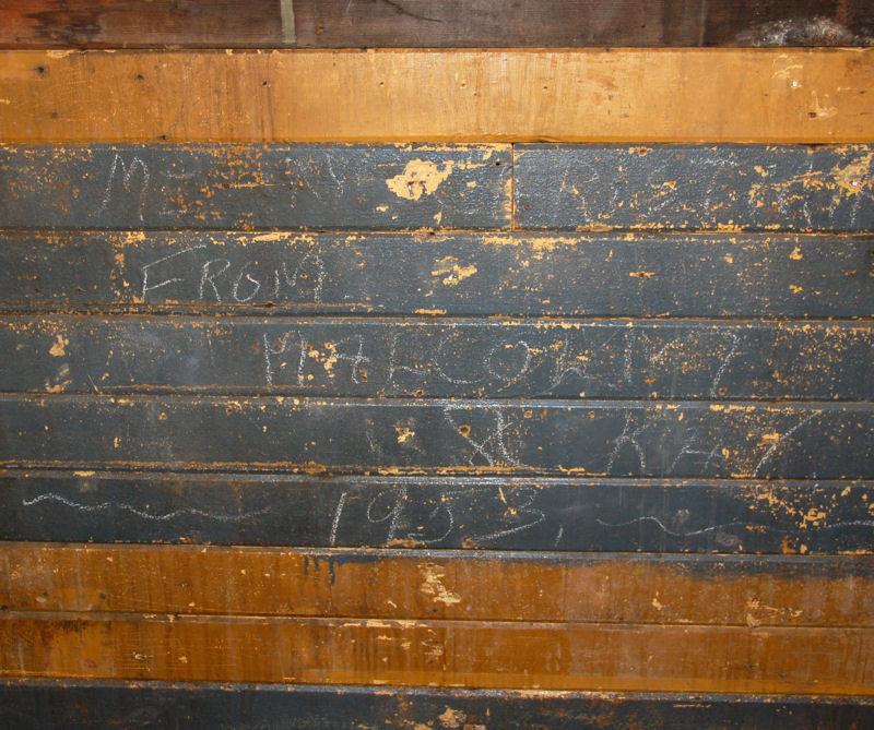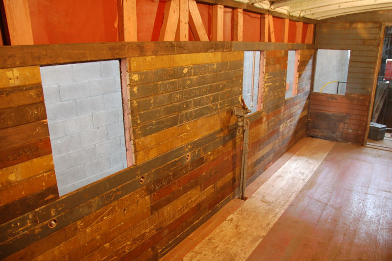 A crew of eleven volunteers worked on many different projects on Saturday. Work continued on the F7 diesel cab as shown in the images above. Joshua, our newest volunteer, applied test paint patches to the CP #7020 using a multi-mark red colour, to the Pyke crane using a yellow colourand to the TH&B #70 caboose for a second test of the red colour and a second test of yellow colour. Inside the caboose, five of our volunteers continued to work on the caboose finishing the tongue and groove covering on the left wall and began work on the right wall. As shown in the middle image of the caboose interior, we carefully reinstalled the boards with the Christmas message we discovered last year and which was featured in a Christmas posting here.