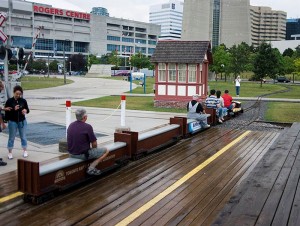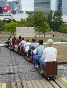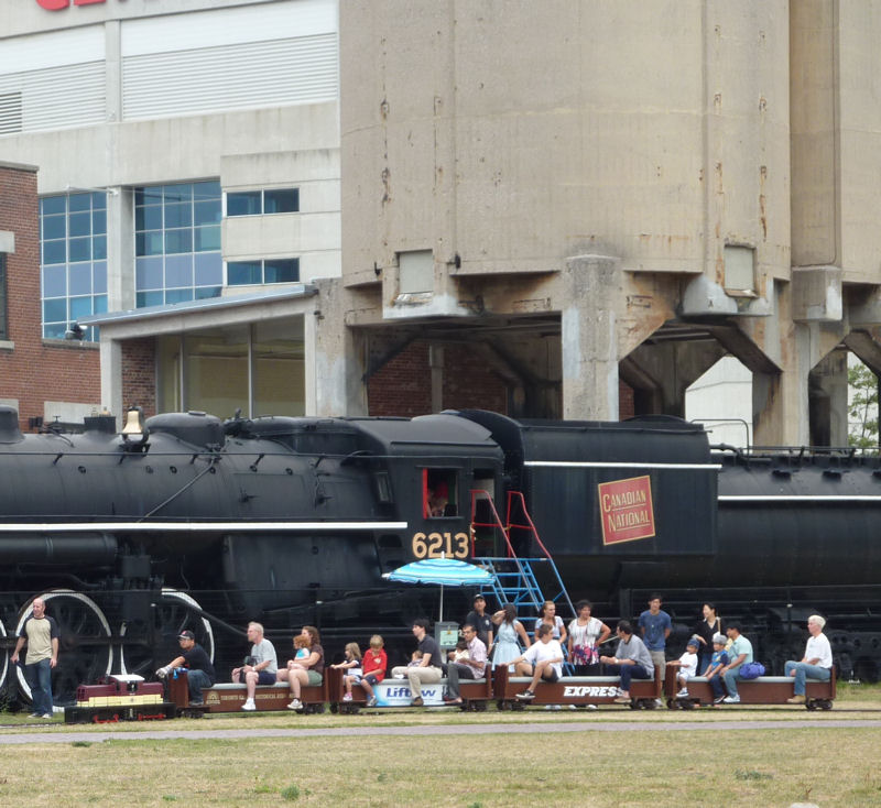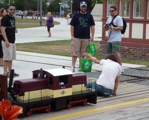 The accompanying pictures highlight the weekend’s operations. In the picture at the lower right, it appears that a woman has fallen in front of the train on Saturday. In fact, she has not. She had laid down in front of the train and then assumed a pose of a terrified woman caught on the tracks for the photographer in front of her. Perhaps we should be planning for photo shoots in Roundhouse Park in future as yet another attraction!