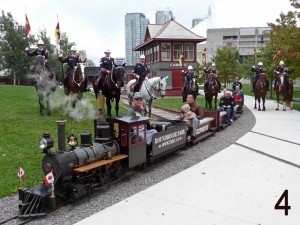 The mounted patrol was first spotted by our ever-alert train crew, at which point Derek Boles rushed over with his camera. The first image shows Mike Salisbury steaming by with a number of passengers probably wondering what was up. Mike, recognizing a photogenic opportunity when he saw one, completed the circuit of Roundhouse Park, steaming past Don for another circuit with the same train load of by-now delighted passengers. Meanwhile Derek identified himself to the officers and they agreed to pose with our train for the many spectators who were gathering with their cameras. In the second photo we see Mike steaming by the east end of Cabin D and bringing the train to a stop. The officers did request that Mike not blow the whistle as it would spook the horses (as it has to hundreds of visitors to Roundhouse Park this summer). In Image 3, we see the patrol positioning themselves around our train and the final image shows the train framed by the most impressive escort we are ever likely to enjoy.