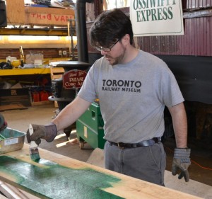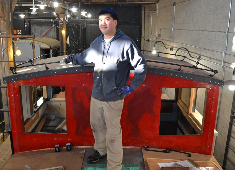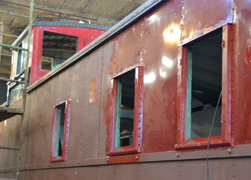 Last weekend, after first clearing more snow from Roundhouse Park to make our museum accessible after the Friday storm, our crew of volunteers concentrated on further restoration of the TH&B caboose. The refurbished handrails on the roof of the cupola were re-installed. They also made great progress on the rebuilding and installation of the roof walkways which had been rebuilt and restored in November of last year.  Work also continued on the rebuilding and painting of the windows and their frames.