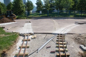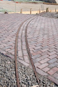 The laying of the “miniature mainline” track in Roundhouse Park is complete except for one short section across a walkway as shown in the upper left picture. Only a number of the crossings and switches remain to be installed. In the centre picture we find that the part of the wye where the track crosses a pedestrian thoroughfare has now been concreted and the track embedded. In the right hand photo, we see how the track has been integrated into the parts of the “mainline” which cross areas with paving stone finishes.