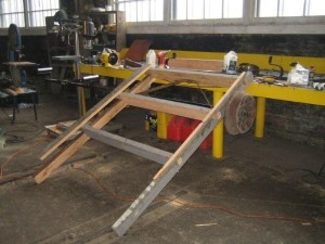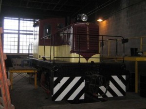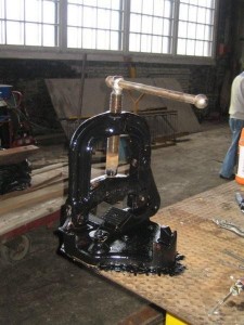 Yesterday, the Toronto Railway Heritage Centre equipment restoration workshop was in action with crews working on two projects, completion of the new paint scheme on locomotive #1 and the construction of a new track maintenance cargo lorry. Photo #1 at the left shows the new look at the front of the CLC-Whitcomb locomotive, and photo #3 at the right is a view of the partially completed wooden lorry frame. Photo #2 in the middle shows a bonus item left behind by the CPR, a Rigid-brand pipe vice salvaged from the floor of a storage room, now cleaned up, painted and ready for use on the end of a workbench.