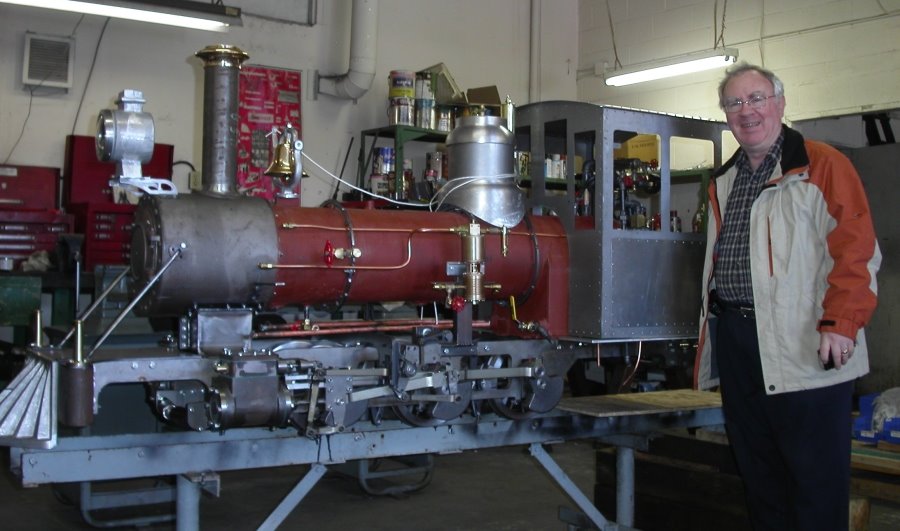As noted in an earlier news item, the cab is now complete and awaits mating with the locomotive. Dave W. picked up the cab last Sunday and brought it to our steam engine assembly shop. Since the reach rod and brake rod were disconnected already, we took the liberty to put the cab in position and take pictures. In the picture we see Dave W. posing with the engine with the cab in place giving us a good idea of the size of the engine and what it will look like when finished.