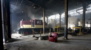 Norm Betts, a professional photographer, has been photographing the progress of work at the roundhouse. Norm has kindly allowed us to present this intriguing shot of the CLC Whitcomb at rest amongst the shrink wrapped equipment.