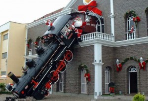 At the above left, we have a picture taken by Stephen Gardiner of the CP Christmas Train as it visits the Toronto area a few weeks ago, The middle image above captures a message found recently in our TH&B Caboose as we renovated it. It reads “Merry Christmas from Malcolm & Kay – 1953”. At the right, we post once again a picture (from the picture collection of a globe trotting couple at this website) of a seasonal Christmas exhibit somewhere in South America which offers a humorous takeoff on a famous picture of a century ago of “the French passenger train that didn’t stop soon enough”.