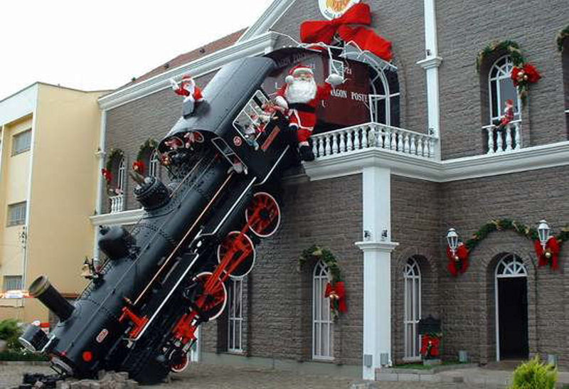 At the above left, we have a picture taken by Stephen Gardiner of the CP Christmas Train as it visits the Toronto area a few weeks ago, The middle image above captures a message found recently in our TH&B Caboose as we renovated it. It reads “Merry Christmas from Malcolm & Kay – 1953”. At the right, we post once again a picture (from the picture collection of a globe trotting couple at this website) of a seasonal Christmas exhibit somewhere in South America which offers a humorous takeoff on a famous picture of a century ago of “the French passenger train that didn’t stop soon enough”.