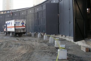 As of the end of this week, we see in the picture at the above left that the new locomotive door ‘hold-open’ posts are now complete. In the middle picture, progress on the interior plumbing system work is evident. In the picture at the right, we see that completed foundations for Don Station. Not shown but also complete are foundations for signal cabin D and its tool shed and the John Street crossing keeper’s shanty.