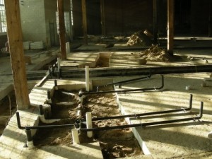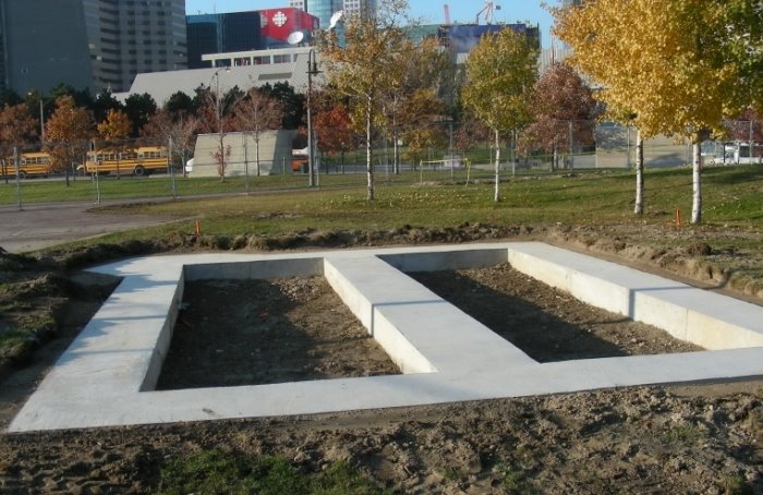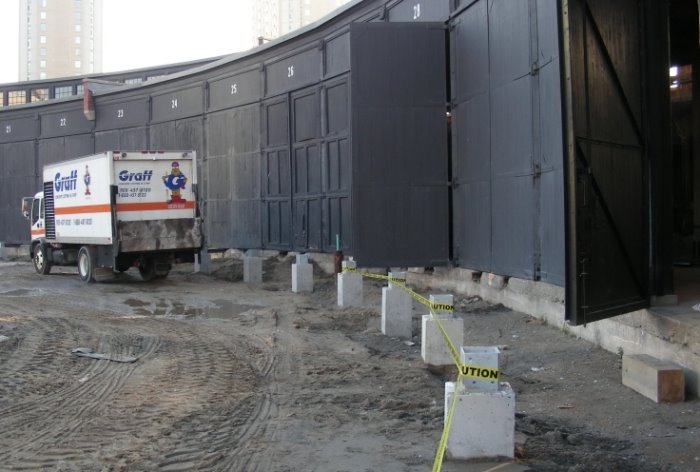 As of the end of this week, we see in the picture at the above left that the new locomotive door ‘hold-open’ posts are now complete. In the middle picture, progress on the interior plumbing system work is evident. In the picture at the right, we see that completed foundations for Don Station. Not shown but also complete are foundations for signal cabin D and its tool shed and the John Street crossing keeper’s shanty.