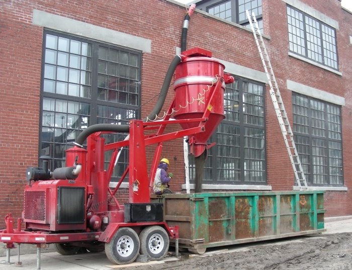 At the left, we see the turntable pit rim being re-waterproofed in preparation for the completion of all of the radial tracks from the turntable to the roundhouse doors. In the next picture, we see a new steel mezzanine under construction for Leon’s going up at the south end of stall 18. In the next picture, this odd bit of kit is a vacuum machine engaged in removing stone from the roof in advance of major re-waterproofing work.